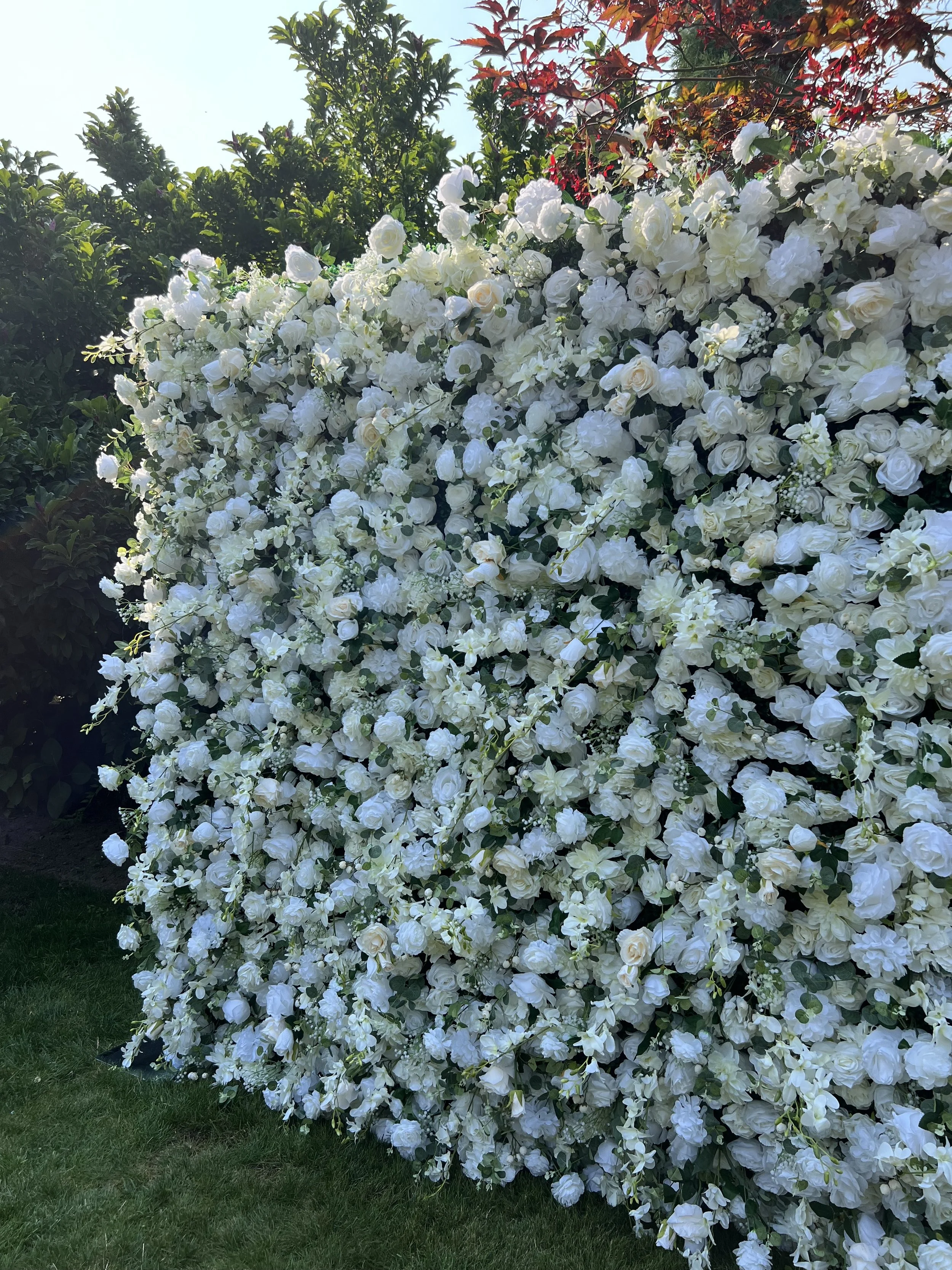 Beautiful silk flower wall (8x8). Stand, sand bags, & drapery included. Pick one of our RGB LED signs to add.